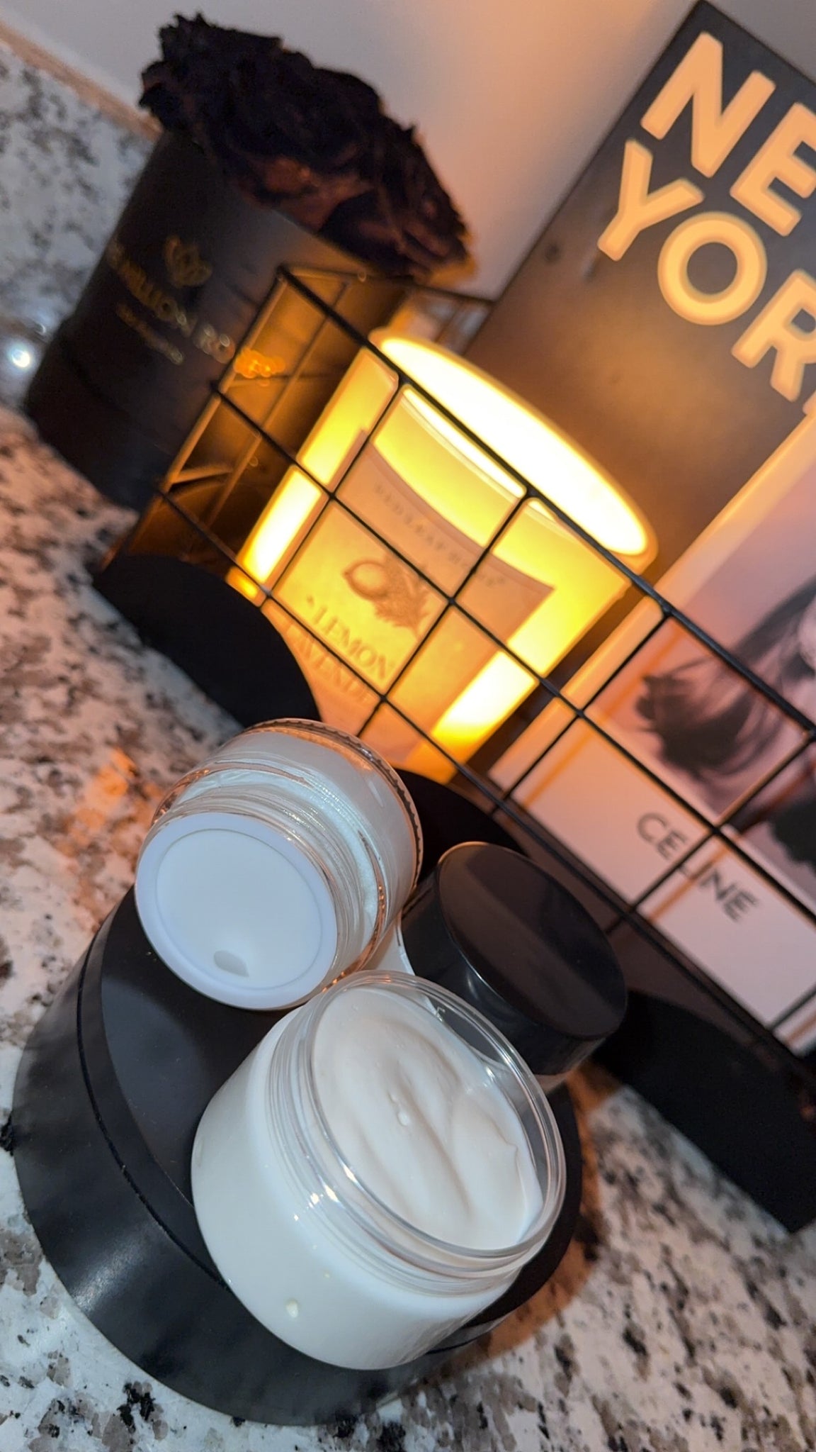 cranberry almond body butter infused with natural oils to help with moisture and soothe your skin.